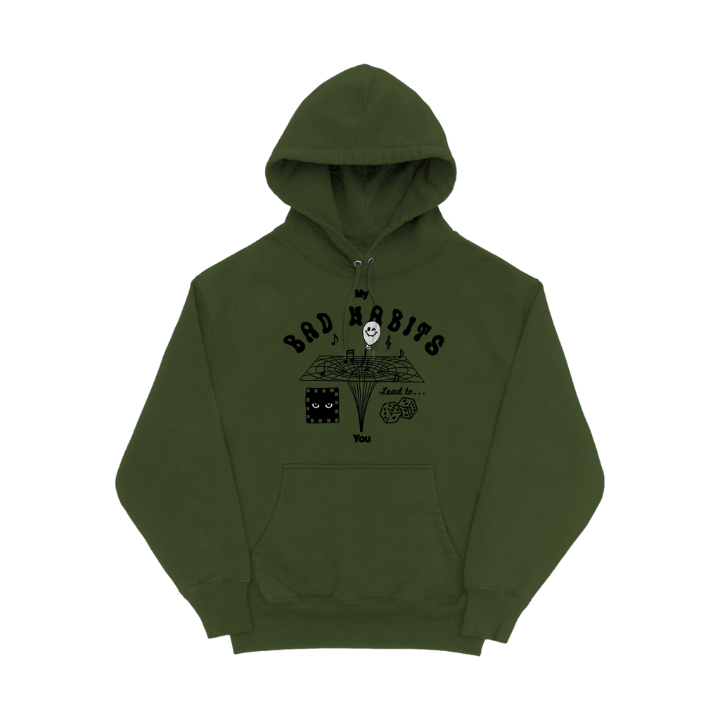 True After Green Hoodie featuring a front and back print in the creative direction of the single Bad Habits. This unisex green hoodie is printed on an environmentally friendly organic garment.